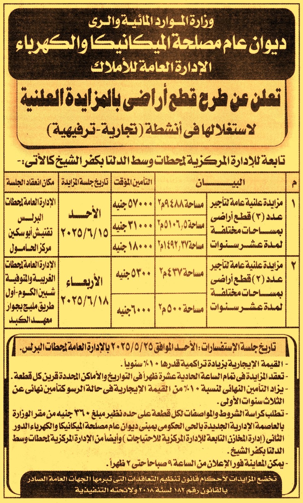 مزايدة علنية لتأجير 3 قطع أراضي بمساحات مختلفة (1) مساحة 9488م2 (2) مساحة 5106.5م2 (3) مساحة 1492.37م2 لاستغلالها في أنشطة تجارية – ترفيهية لمدة 10 سنوات بزيادة 10% سنويا جلسة الاستفسارات يوم 25/5/2025 ويمكن المعاينة من الساعة 9 ص حتى 2 ظ