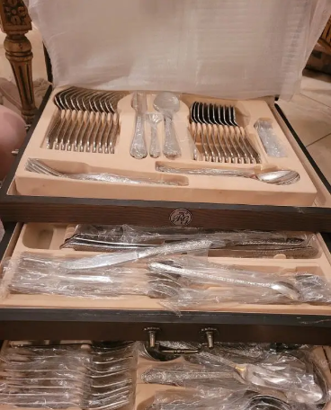 طقم ملاعق وشوك وسكاكين مستورد ١٢٨ قطعة ماركة R. G جديد وارد الخارج علبة خشب ٣ ادوار