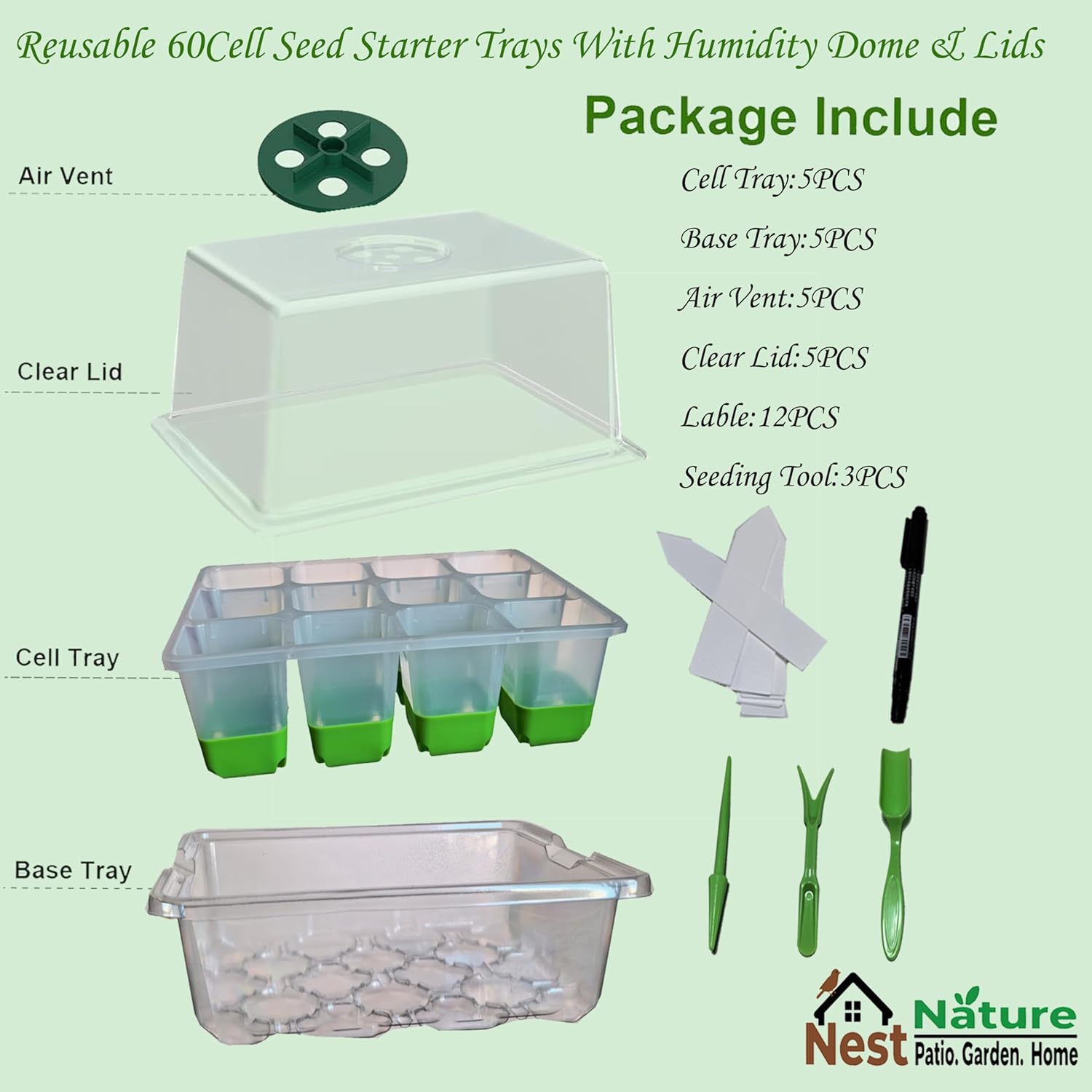 | Included Components | Air Vent:5PCS/Clear LId:5PSC, Lable:12PCS, Marker pen:1PC, Planting Cell:60 PCS/Cell Tray:5PCS/Base Tray:5PCS, Seeding Tool:3PCS |