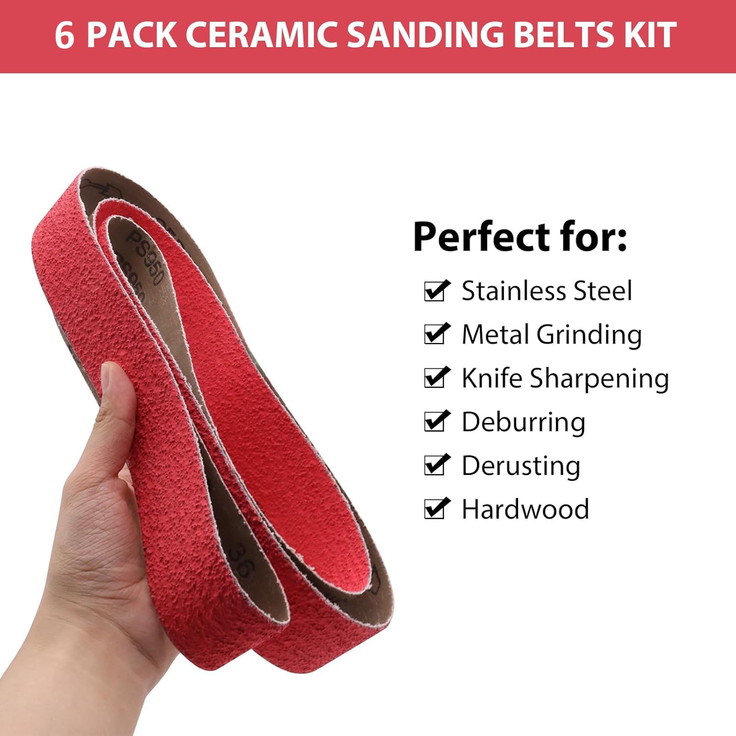 Transform your metalworking and woodworking projects with this premium 6-pack ceramic sanding belts kit. These professional-grade 2x72 inch belts feature a robust ceramic aluminum oxide coating that delivers superior material removal and consistent finishing. Perfect for stainless steel, metal grinding, knife sharpening, deburring, derusting, and hardwood applications. The precision-engineered seamless design prevents unwanted marking while maintaining uniform pressure across work surfaces. Each belt is constructed with multiple reinforced layers for extended durability and reliable performance. The kit includes various grits from 40 to 120, allowing you to progress from aggressive material removal to refined finishing. These versatile belts excel at contouring edges, smoothing surfaces, and achieving precise finishes on both flat and curved workpieces. The bright red belts come conveniently bundled with a securing strip for easy storage and organization. Ideal for both professional workshops and serious DIY enthusiasts seeking consistent, high-quality results.