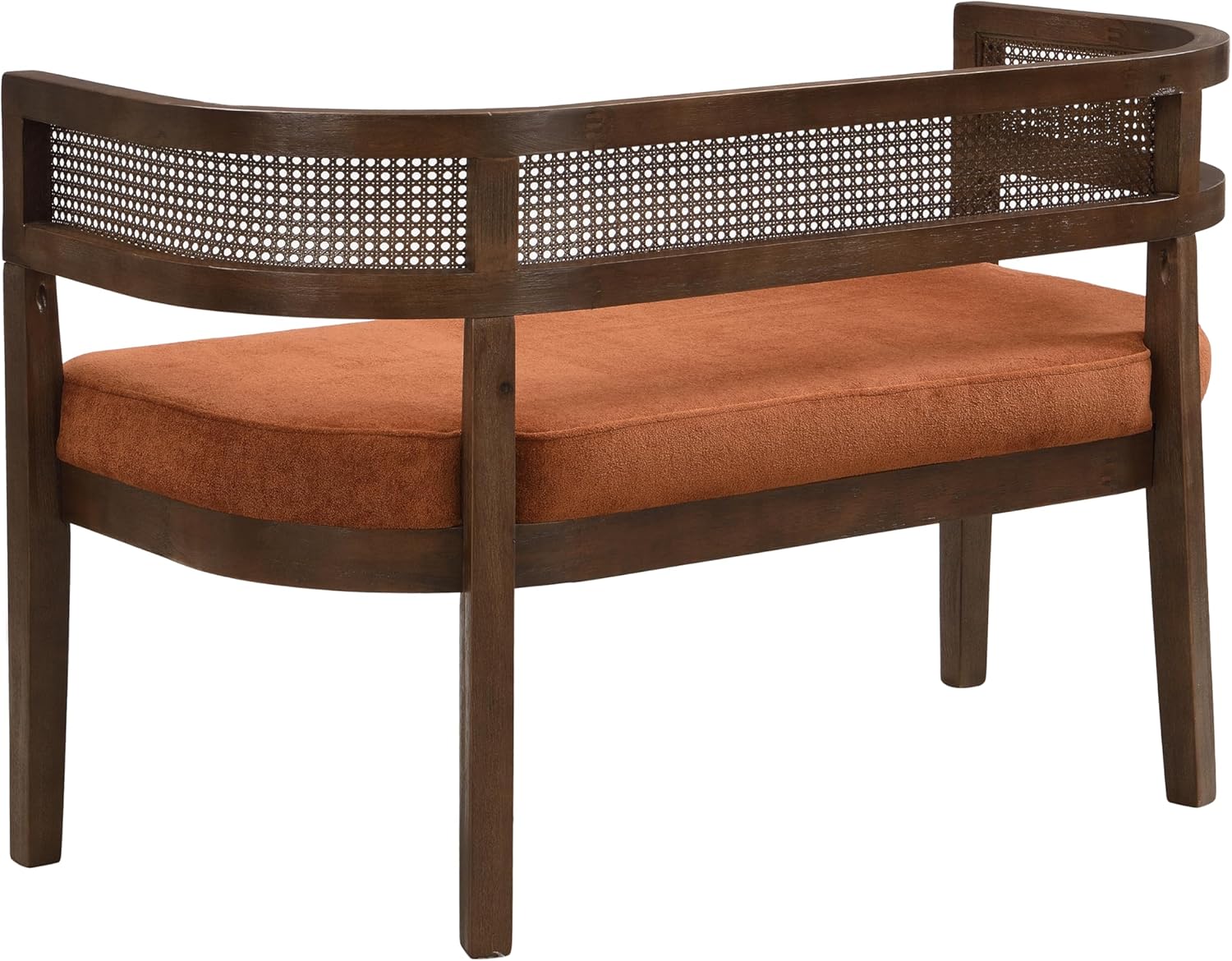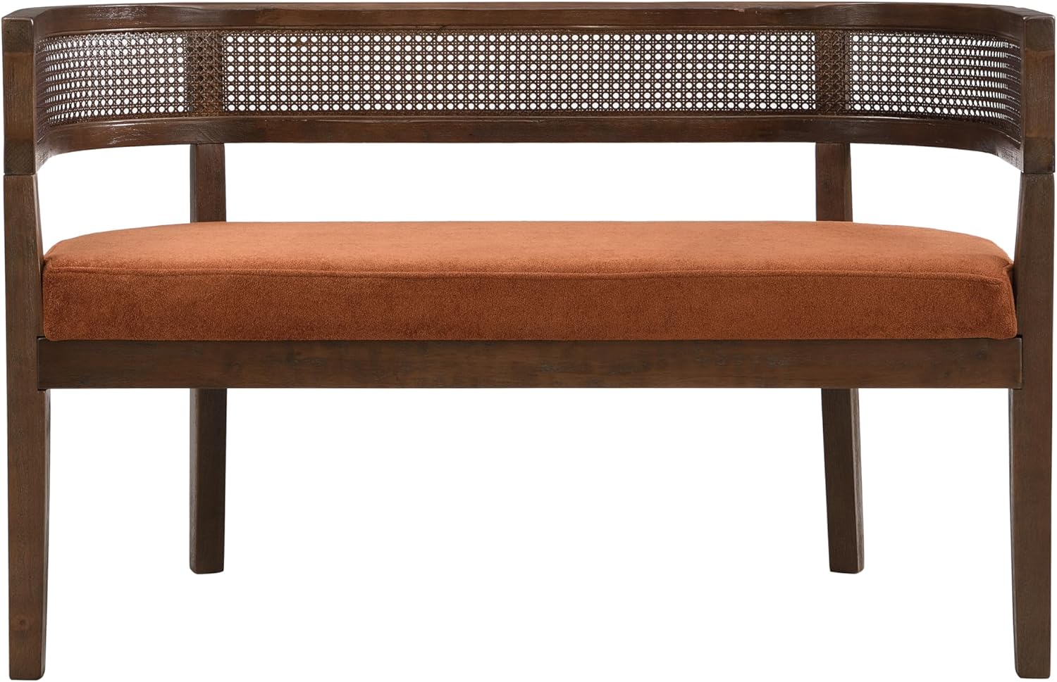 This loveseat blends modern elegance with artisanal detailing, featuring a fabric-upholstered seat and a thick, supportive cushion for everyday comfort. Its sturdy rubberwood frame ensures long-lasting stability, while the hand-woven rattan backrest adds natural texture and airflow. Compact yet stylish, it fits beautifully in living rooms, bedrooms, entryways, and cozy reading corners.