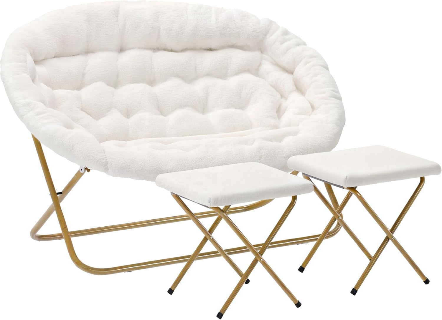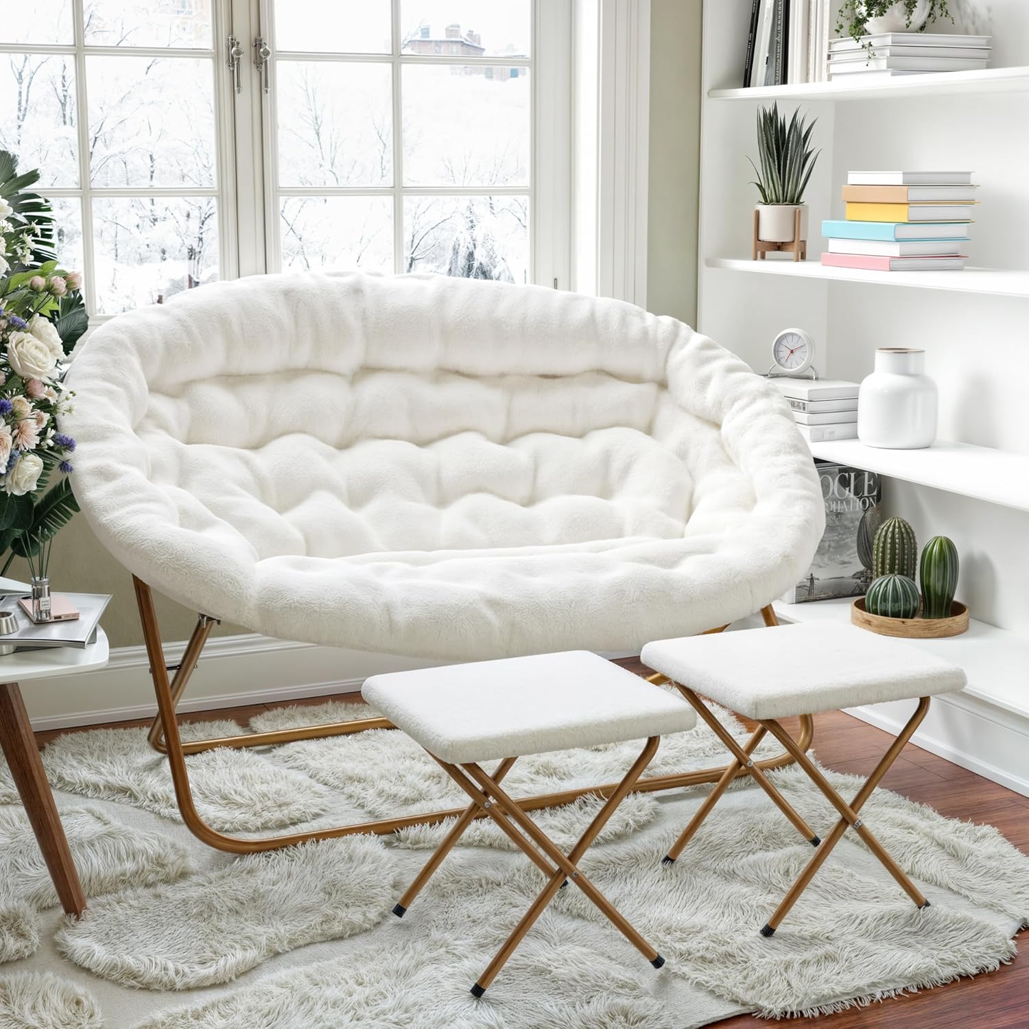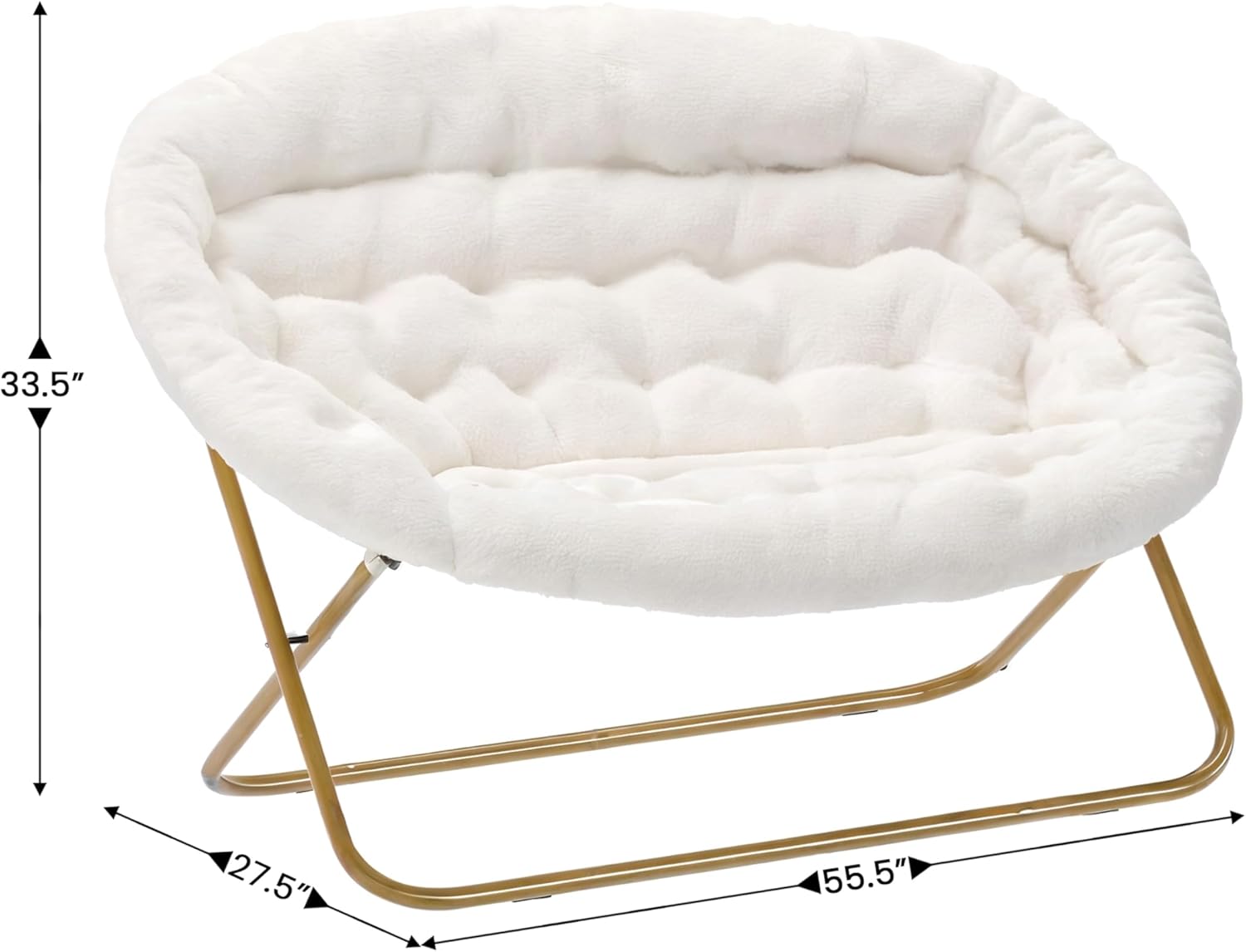 Elevate your favorite hang out spot and cradle yourself in cozy comfort with this double saucer chair with 2 ottomans perfect for living room, dorm and bedroom use. Both practical and stylish, this seating solution boasts extra space and unparalleled comfort with the extra padding. With their beautiful faux fur upholstery and sleek steel frames, this set exudes modern elegance while providing the snuggle worthy softness you crave. The lightweight, foldable design makes this chair and ottoman set highly portable and easily stored when not in use. The sleek design is not just for looks; it's also incredibly durable with the chair holding up to 300 lbs. static weight capacity while the ottomans hold up to 200 lbs. static weight each and feature removable cushions. Just unfold each piece and you're ready for study or leisure time. With no assembly required, your new seating is ready for use right out of the box and wipes clean with a damp cloth and neutral detergent.