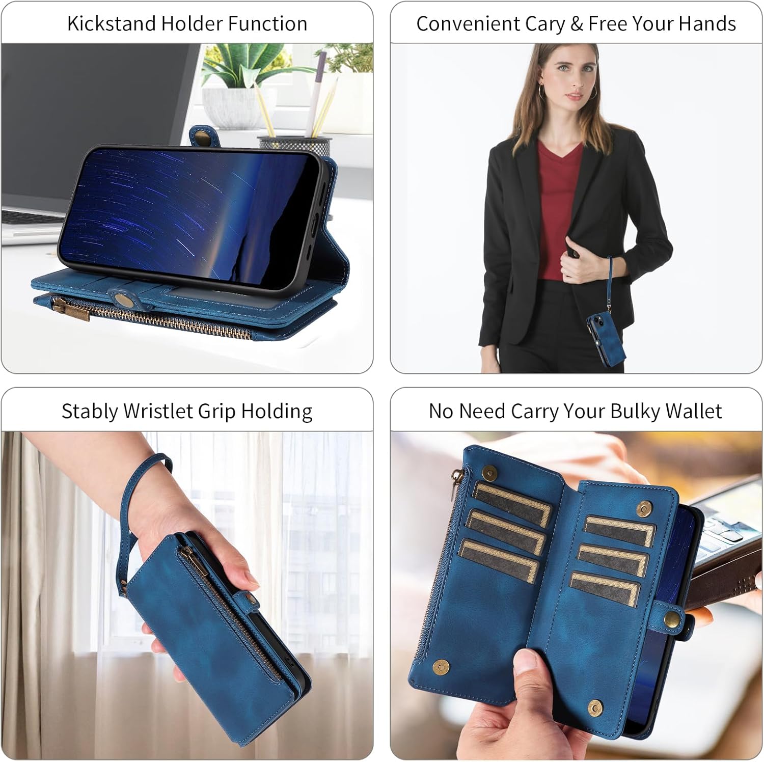 | Additional Features | Card Slot, Kickstand, RFID Blocking, Wrist Strap, Zipper Pocket |
