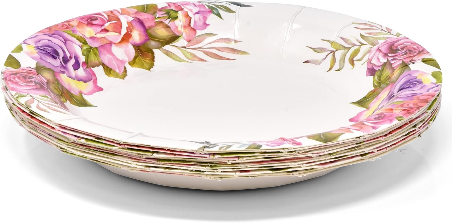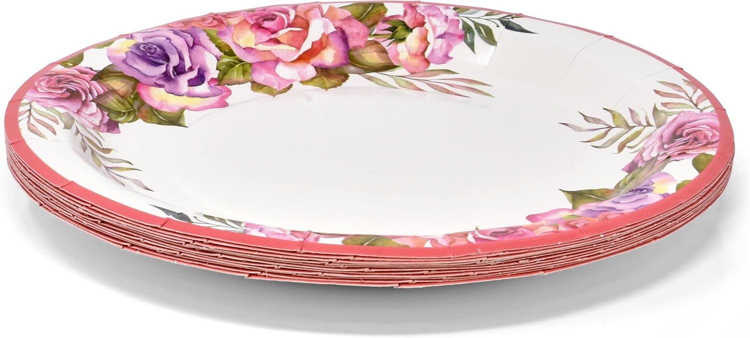 Floral Party Set Serves 24: Gift Boutique flowers party set includes 24 9” dinner plates 24 7” dessert plates, 24 luncheon napkins, 24 9 oz cups featuring pink and purple flowers with a pink border on a white background. High Quality: Plates are made of high-quality thick paper. Napkins are soft and absorbent. Great for a baby shower, birthday party, wedding or bridal shower. Do NOT place the plates in the microwave. Cups are for cold drinks only. Enough For Your Guests: Stock up with this set of quality plates, cups and napkins to make sure you have enough for your party or event. The floral party set really adds dimension to your party as your guests will love the elegant design. This party set is the perfect addition for a floral themed baby shower or party. More Time To Enjoy: Disposable paper reduces clean-up time so you can enjoy more time with friends and family at this spring flowers themed party. After the party just collect the tablecloths with all the garbage and throw it into the trash can. Dimensions: Dinner plates measure 9” in diameter and dessert plates measure 7”. Cups are 9 oz. capacity. Napkins are 3-ply and measure 13” x 13” when unfolded and 6.5” x 6.5” when folded.