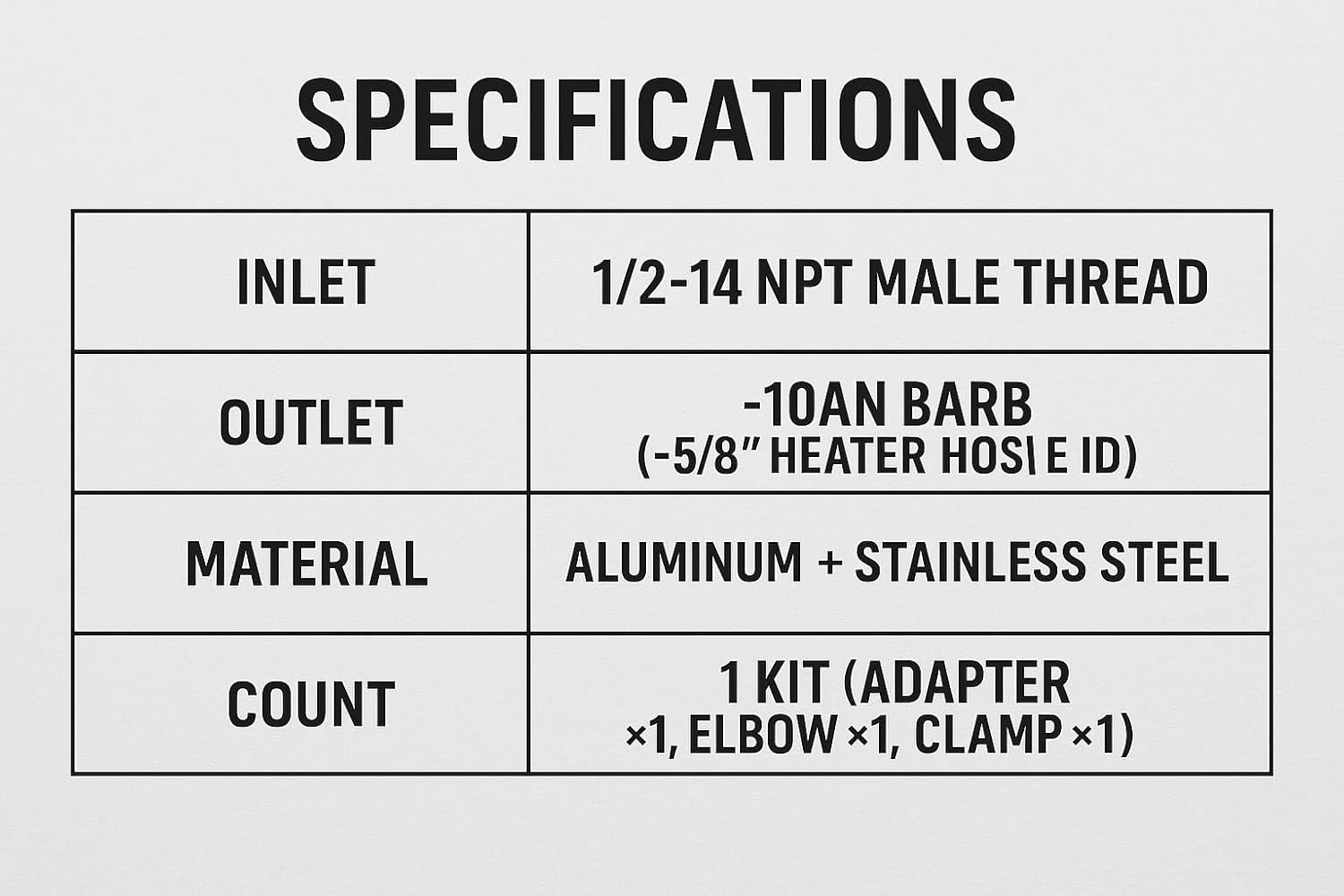 | Included Components | 1 × -10AN threaded adapter, 1 × 90° aluminum hose barb elbow, 1 × stainless worm-drive clamp. |