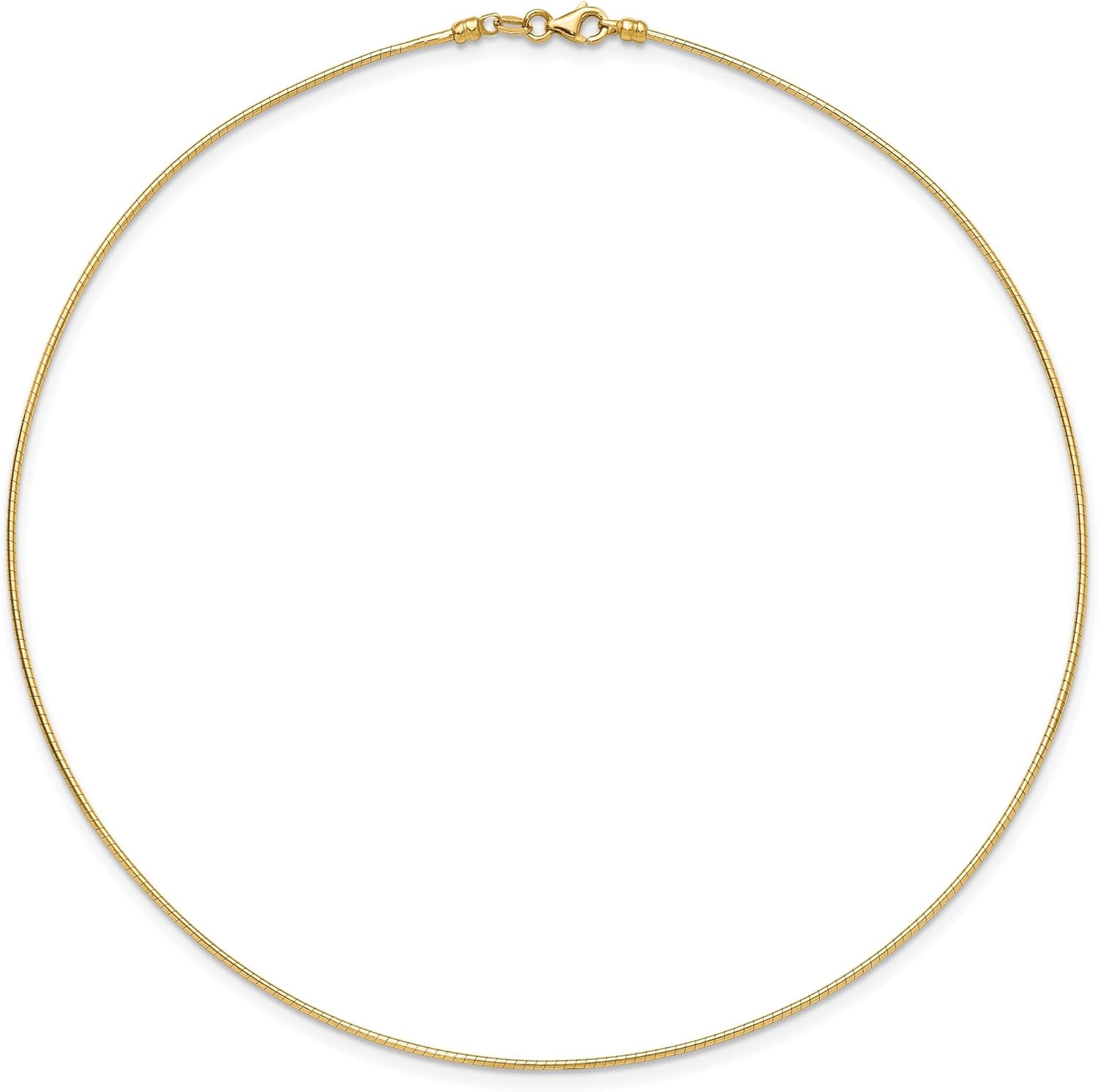 A classic omega style chocker necklace crafted in real 14k gold that has a diamond cut finish. This 2mm width gold omega chain is secured by a lobster clasp and has a shiny look and will never tarnish. The necklace comes in different lengths. Weights are 16inch - 6.7gr, 18inch - 7.5gr