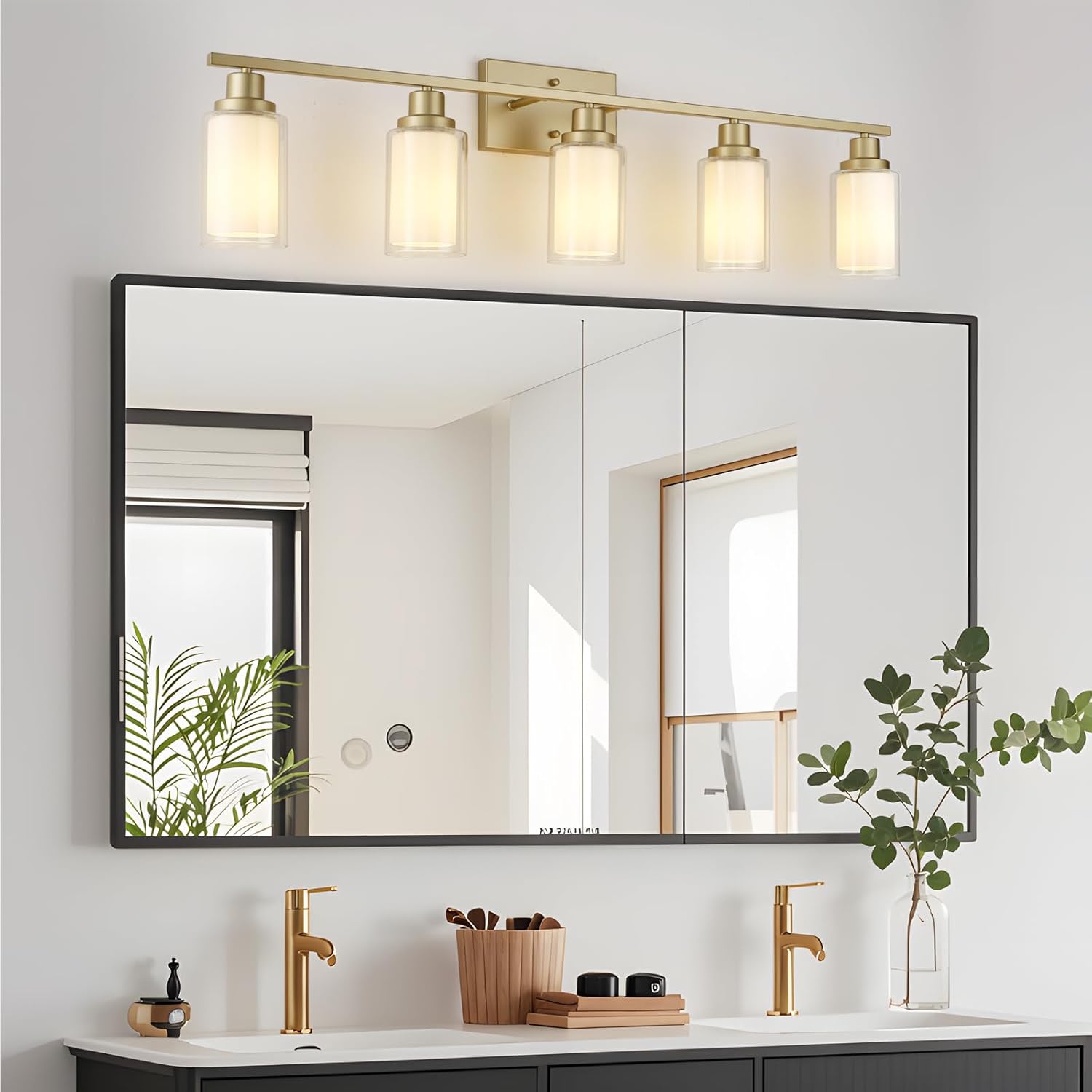Elevate your bathroom's ambiance with this stunning 5-light vanity fixture from Jonsi. The sophisticated gold finish creates a luxurious look while complementing contemporary and traditional decor styles. Each of the five clear ribbed glass shades provides beautiful illumination, perfect for grooming tasks and creating a warm atmosphere. The linear design features an elegant horizontal bar that aligns the shades perfectly, while the round wall mount adds a classic touch. This fixture's premium construction and timeless design make it an excellent choice for master bathrooms, powder rooms, or any space requiring both functional and decorative lighting. The clear glass shades allow maximum light output while adding visual interest through their subtle texture. Whether installed above a mirror or as a statement piece, this vanity light combines practical illumination with sophisticated style.