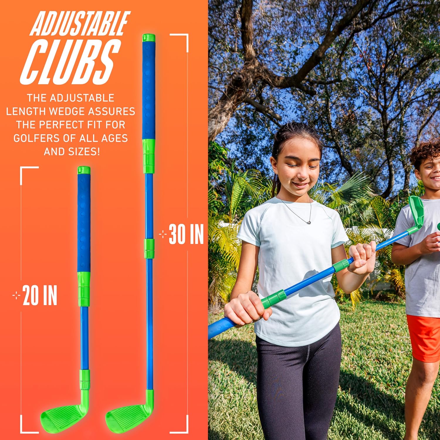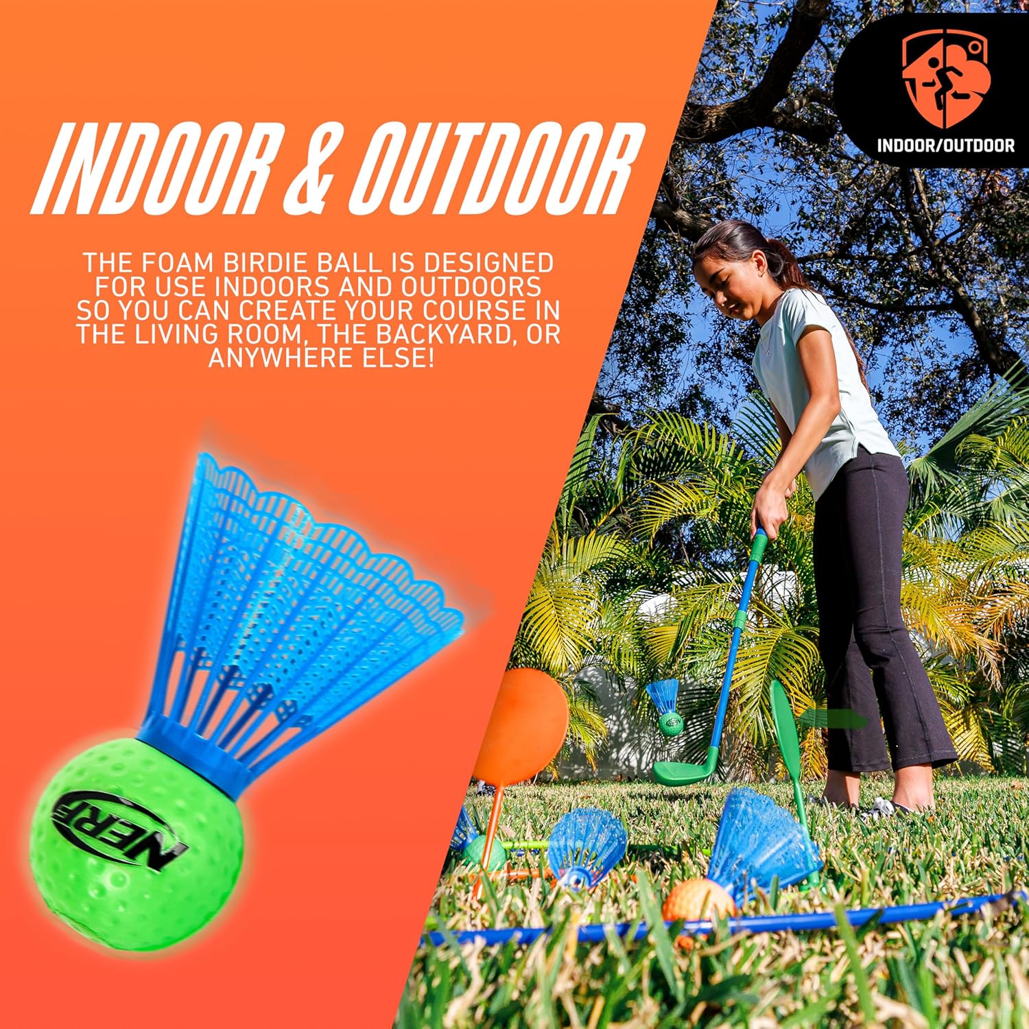 Hit the green anywhere with the NERF Birdie golf game. This game sets up fast, simply place the flags into the scoring rings and set up into any layout for a challenge. The included [2] wedge golf clubs that are adjustable so kids 6+ can practice their chipping and improve their game. The birdies are integrated into the foam golf balls and act as a golf tee to make it easier for kids to score points. This is the complete set, it comes with [2] wedges [6] birdie balls [3] scoring rings and a carry bag so you can take anywhere on the go! Get out there and perfect your golf game with the NERF Birdie Golf Game.