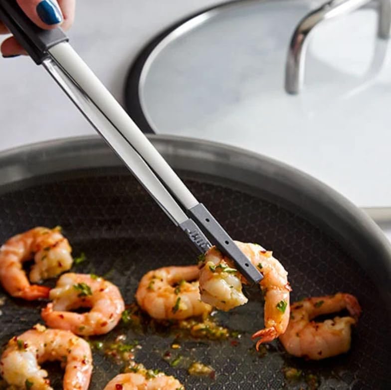 Elevate your cooking experience with these must-have Kitchen Tweezers, perfect for handling delicate or small foods like scallops, shrimp, bacon, pot stickers, and bite-sized chicken or beef. They're also great for effortlessly retrieving olives, pickles, and other condiments from jars. Key Features: Secure Grip: Ridged silicone tips ensure a firm hold on foods without slipping. Cookware Safe: Gentle on all cookware, including non-stick surfaces. High-Heat Resistant: Withstand temperatures up to 450°F (230°C). Convenient Storage: Folds flat for easy storage. Easy to Clean: Dishwasher-safe for hassle-free cleanup. Dimensions: 12" (30 cm) Guarantee: Backed by a 3-year guarantee for your peace of mind. Upgrade your kitchen tools today with these durable, versatile, and user-friendly Kitchen Tweezers!