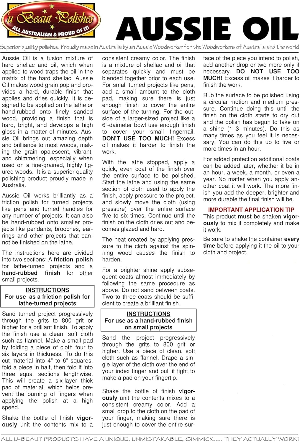 Aussie Oil makes wood grain pop, and provides a hard, durable finish that's easy to apply and quick to dry. Designed to to be applied on the lathe or hand-rubbed onto the finely sanded wood, providing a finish that develops a bright, high gloss in a matter of minutes. Brings out the depth and brilliance of most woods, making the grain opalescent, vibrant, and shimmering, especially when used on fine-grained, highly figured woods. Ideally used as a friction polish on the lathe for turning projects like pens, handles, peppermills, and so many more. It can also be applied by hand onto smaller projects like pendants, brooches, earings, and other woodworking projects that cannot be finished on a lathe.