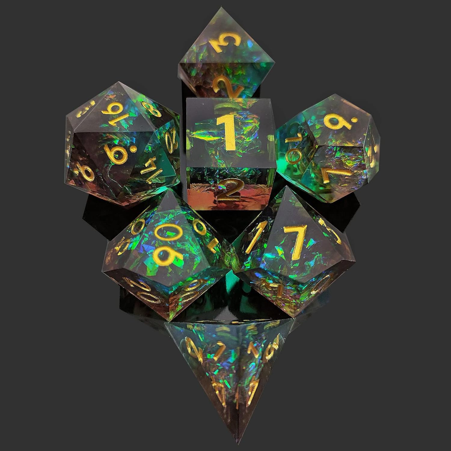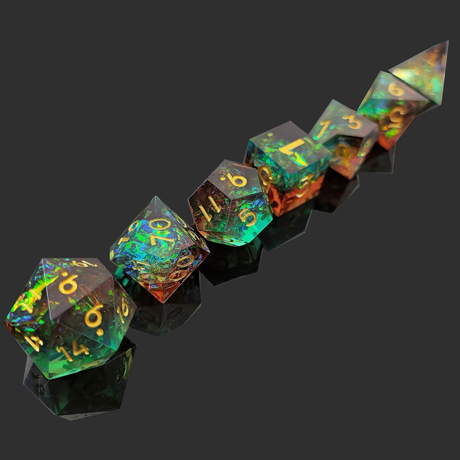 Each dice is hand-made by silicone molds, from pouring, polishing, coloring, to the pursuit of perfection step by step, to keep improving, to ensure the superior quality of the dice.For a unique visual effect, the dice adopts advanced glue injection technology to let the beautiful inclusions blend into it well. The overall hand-polishing gives it a mirror appearance, and you can clearly see the beautiful inclusions inside! At the same time, the overall casting process allows it to have a high degree of balance and 100% randomness. Don't worry about always throwing the same number!The beautiful inclusions give it a different display effect under different angles of light, allowing you to get praise from your friends in the board game, and adding a touch to your game night. Mysterious power.Seven dice weight: 1.2oz (36 grams)Note: These dice have very sharp edges, especially D4. Please keep it out of the reach of children, otherwise it may cause injuryAfter-sales service guarantee: We have 30-day after-sales service. If you have any questions or encounter problems, please contact us directly. We will reply as soon as possible!Due to the brightness of the display and the brightness of the light, the actual color of the product may be slightly different from the website picture, please understand!Because these dice are made by hand, there will be slight imperfections, such as slight scratches and few ink unevenness. Please understand!