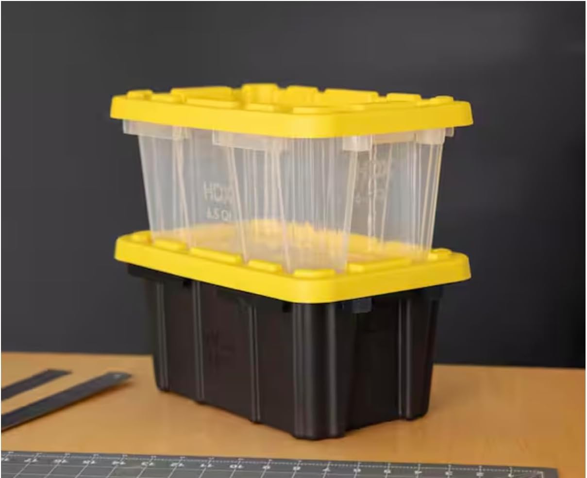 Transform your storage solutions with this versatile plastic storage tote container. Featuring a vibrant yellow lid that makes it easy to identify contents at a glance, this 6.5-quart capacity container is perfect for organizing household items, seasonal decorations, or office supplies. The transparent design allows you to quickly locate stored items without opening the container, while the sturdy construction ensures durability for long-term use. With dimensions of 12 x 12 x 8 inches, this storage tote fits conveniently in closets, under beds, or on shelving units. The lidded design keeps contents secure and protected from dust, while making these containers stackable for efficient use of vertical space. Ideal for home organization projects, this storage solution helps maximize space while maintaining visibility of your stored items.