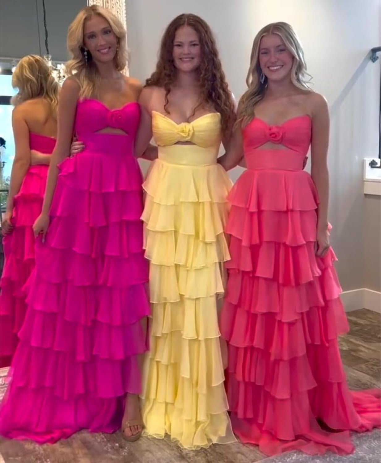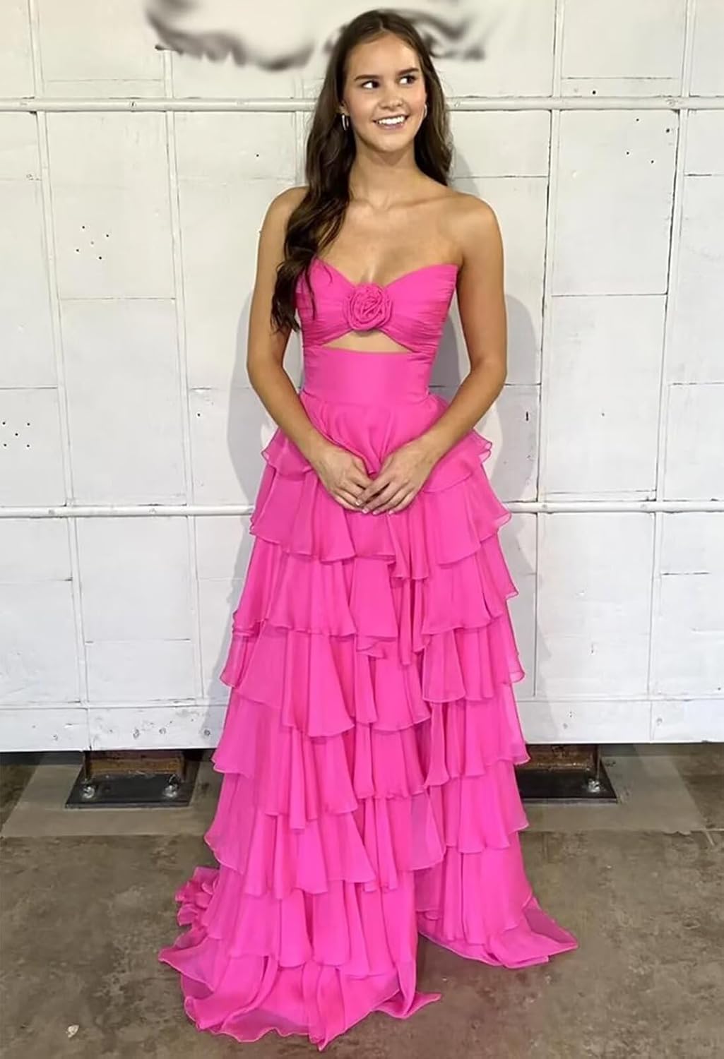 | Embellishment Feature | 3d flower keyhole cut out, open back backless lace up back, strapless tube top, tiered chiffon corset, with slit floor length sleeveless |