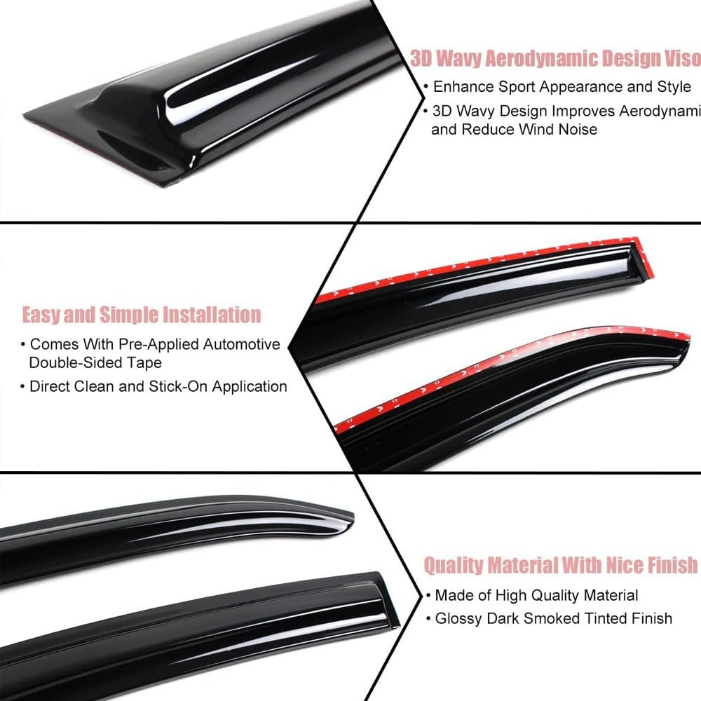 • 4. 100% Brand New In Box. Make of High Quality Material Allow You To Roll Down The Window During Rain/Snow Weather To Get Fresh Air and To Defrog The Glass Help Reduce Heat Buildup In The Parked Vehicles By Allowing Air in During Rainny Weather Long Lasting Material Designed To Withstand The Rigors Of The Elements. Comes With 3M Automotive-Grade Tapes. Easy Installation. Dramatically Improve Styling & Appearance. This is not in-channel style item.