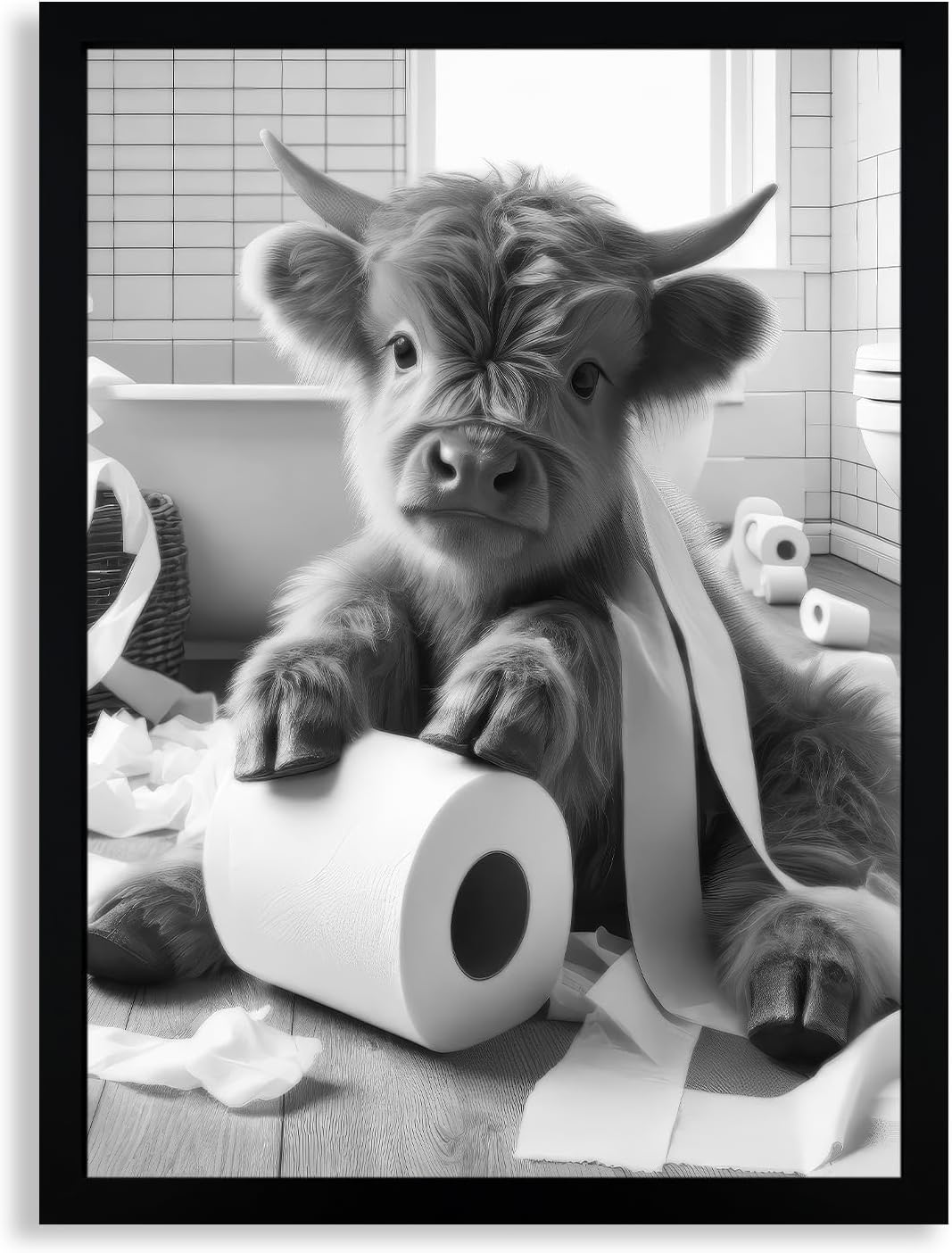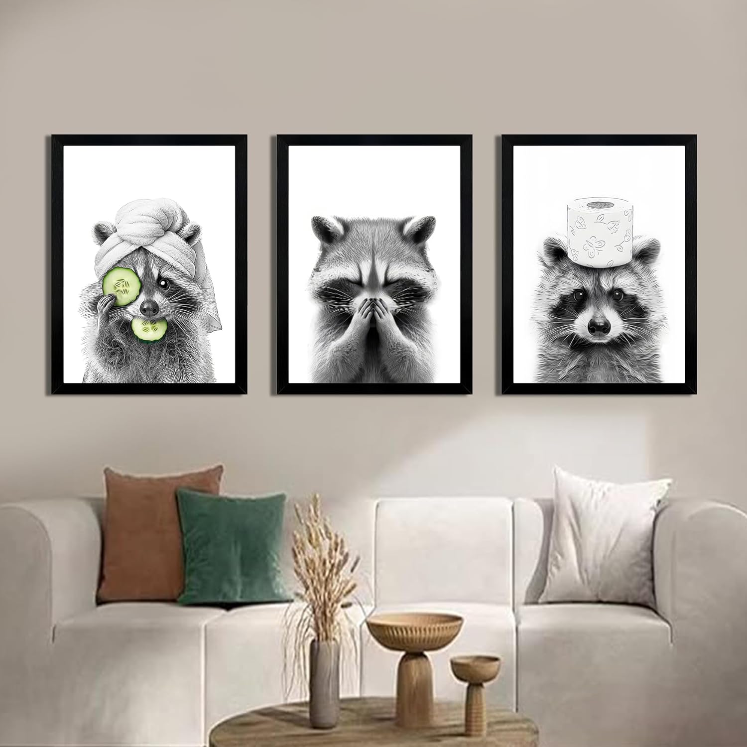 Our charming Wall Art Set is an absolute must-have for those seeking to infuse a touch of whimsy and style into their living spaces. Comprising three exquisitely designed pieces, each measuring a perfectly proportioned 12"x16", this set is destined to become the focal point of any room it adorns.The centerpiece of this collection lies in its captivating animal-themed designs. Delightful raccoons take center stage, depicted in the most endearing and comical scenarios. Picture one raccoon with a fluffy towel wrapped around its head, cucumber slices delicately placed over its eyes as if indulging in a luxurious spa day right there on your wall. Another has its tiny paws covering its mouth, seemingly stifling a giggle, while the third dons a makeshift hat crafted from a roll of toilet paper, adding an element of playfulness that is simply irresistible. Printed on high-quality canvas, the artwork showcases an impeccable level of detail.