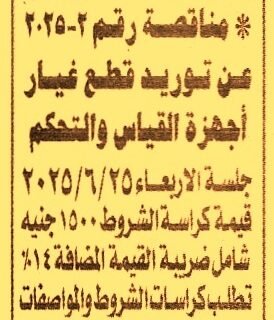 مناقصة عامة لعملية توريد قطع غيار أجهزة القياس والتحكمNourhanMagdy1مايو 29, 2025مناقصة عامة لعملية توريد قطع غيار أجهزة القياس والتحكم رقم 2/2025 ... اقرأ المزيد