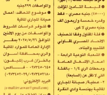 مناقصة عامة لعملية صيانة المجاري المائية بهندسة إدفو غربNourhanMagdy1مايو 26, 2025مناقصة عامة لعملية صيانة المجاري المائية بهندسة إدفو غرب للعامين الماليين 2024/2025 –2025/2026 – 2026/2027 (فئة التصنيف السابعة شعبة أشغال ... اقرأ المزيد