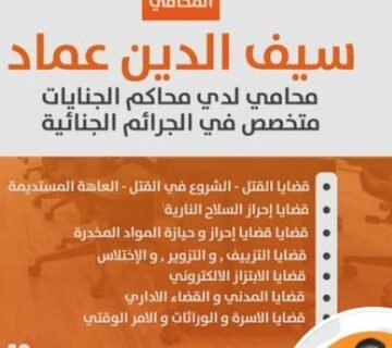 مكتب سيف الدين عماد المحاميZamzam Mohamedمايو 28, 2025مكتب سيف الدين عماد المحامي محــامــي لــدي مـحـكمـة الجنايات – الـجـنح – مجلــس الدولة – النــيابة الادارية – المدني – ... اقرأ المزيد