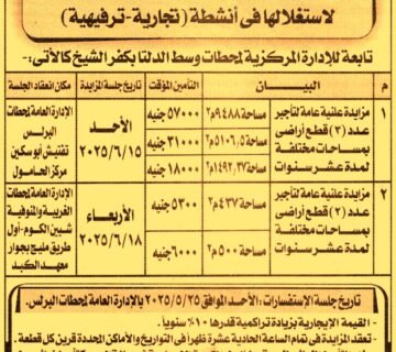 مزايدة علنية لتأجير 3 قطع أراضي بمساحات مختلفةNourhanMagdy1مايو 18, 2025مزايدة علنية لتأجير 3 قطع أراضي بمساحات مختلفة (1) مساحة 9488م2 (2) مساحة 5106.5م2 (3) مساحة 1492.37م2 لاستغلالها في أنشطة ... اقرأ المزيد