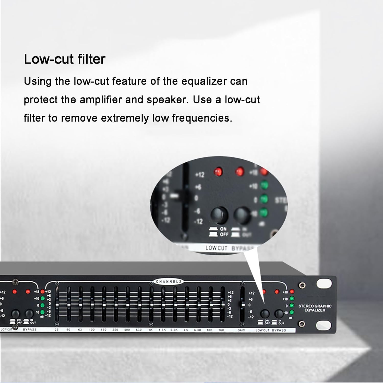 Specifications Product Name:Graphic Equalizer Input: Balanced Input interface: XLR, 1/4" TRS Level control range: -12dB~+12dB Maximum level: 28dBV Output: Unbalanced Output interface: XLR, 1/4" TRS Maximum level: +/-20dBV Limiting LED threshold: 3dB Low-cut filter: 40Hz, 12dB Frequency response: 20Hz~20KHz, +/-1dB Signal-to-noise ratio: 95dB Dimensions: 48.2*12.7*4.4cm