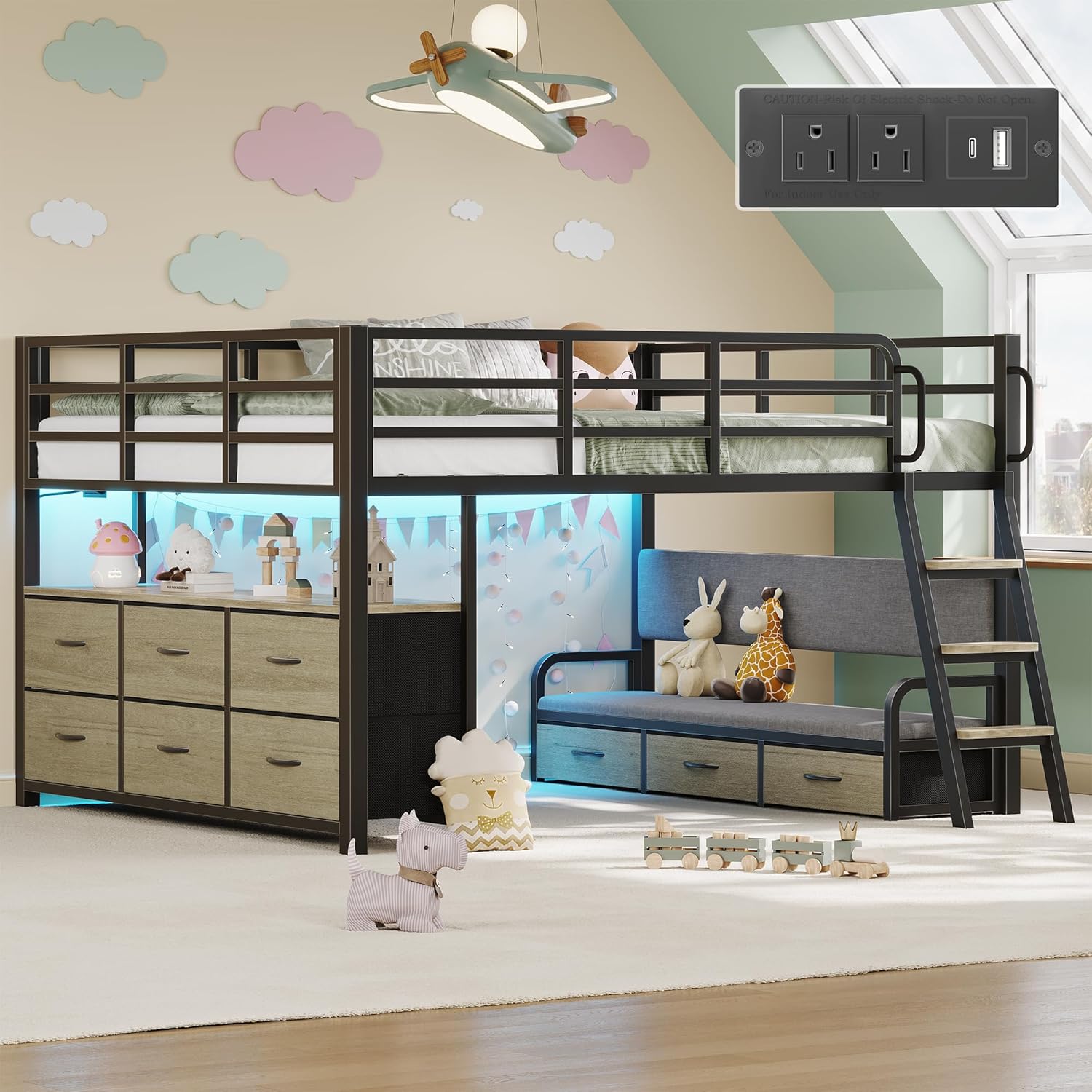| Included Components | 9 Storage Drawers, Charging Stations and Widened stair tread of the sloped ladder, Fence height 15.8", LED Lights, Safety handrail and Soft cushion sofa, |