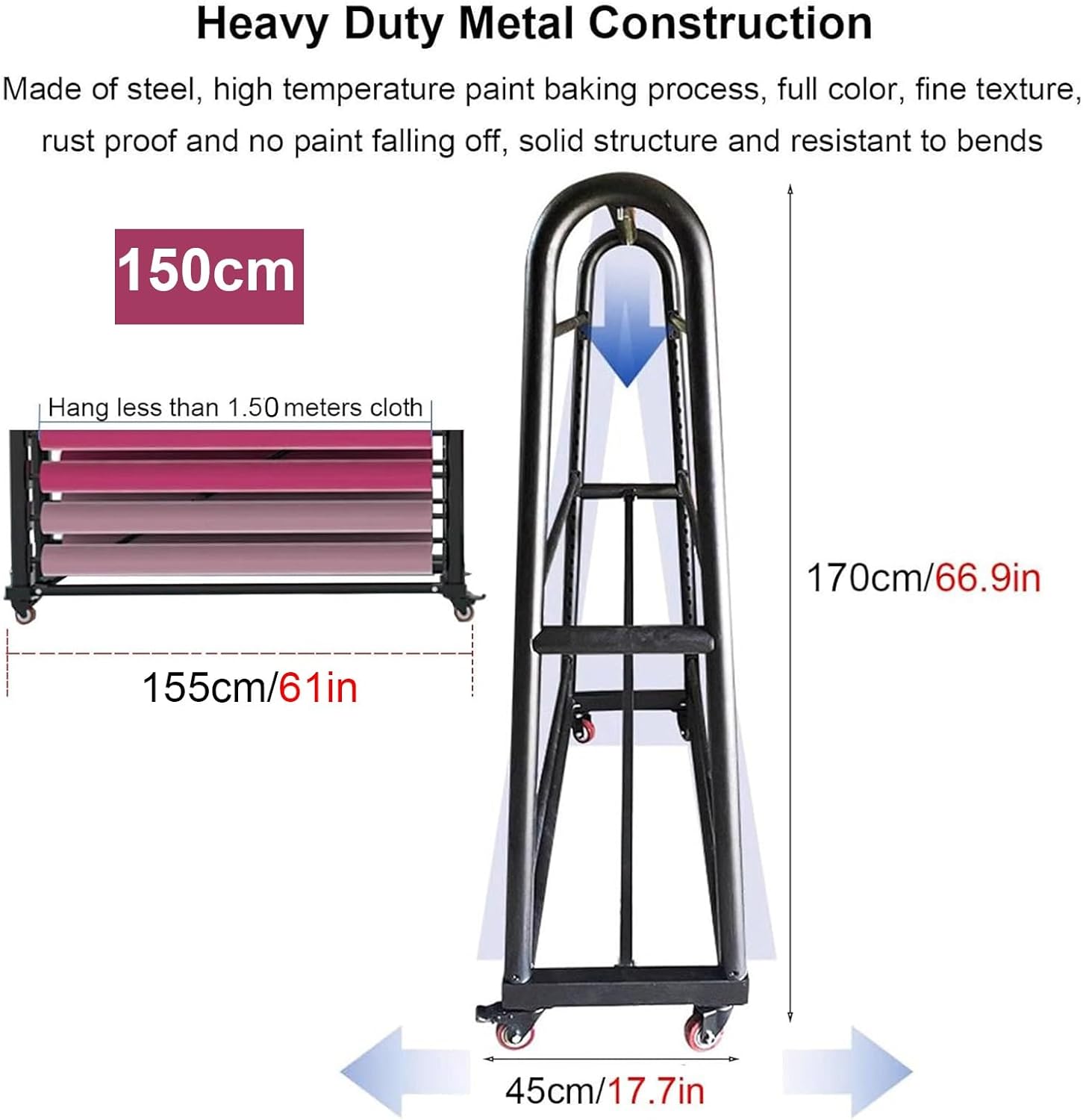 Introducing our premium storage rack, expertly crafted for the efficient organization of vinyl wraps and fabric rolls. This versatile solution effortlessly combines functionality and convenience, making it an essential addition to any workspace or storage area. Designed with a detachable hanging rod, our rack allows you to easily access and display your materials, ensuring that everything is within reach when you need it. Its horizontal storage capability maximizes space efficiency, making it ideal for use in shopping malls, supermarkets, warehouses, garages, and auto detailing shops. Constructed from high-quality metal, this storage rack features a robust exterior layer for enhanced durability and longevity. The adjustable snap-on design allows you to customize the spacing between sections to accommodate various items, making it a flexible option for diverse storage needs. Key features include: - **Easy to Clean**: Simply wipe down with a damp cloth to keep it looking fresh. - **Compact Design**: Occupies minimal space while maximizing organizational benefits in your home or business. - **360° Rotatable Wheels**: Effortlessly move the rack around your space, facilitating easy cleaning and reorganization. Please note that due to the new materials used, there may be a slight odor upon unboxing. This will dissipate after a few days of airing out in a well-ventilated area. Elevate your organization game with our storage rack, where practicality meets style, ensuring your materials are organized and accessible whenever you need them.