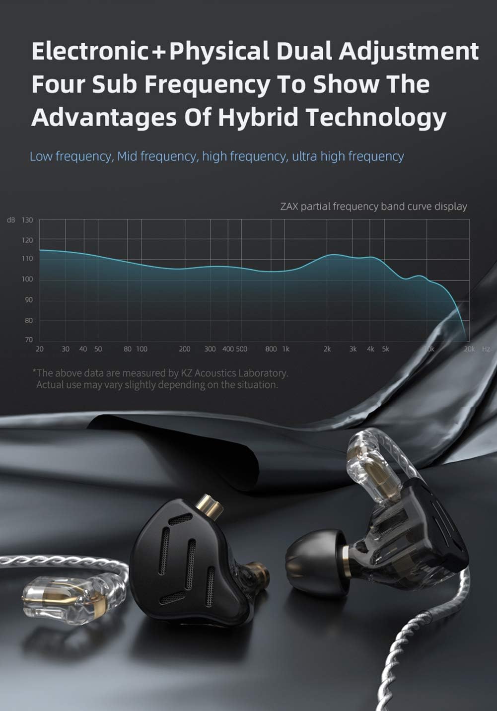 SPECIFICATIONS Brand: KZ Model: ZAX Drive Unit: 7BA+1DD Connectivity:Wired Wear:Ear hook Earphone type: In-Ear Plug type: 3.5mm plug Pin type : 0.75mm 2PIN Sensitivity: 113dB/mW Impedance: 24Ω Frequency range: 10Hz-40kHz Weight: 27±3g Color: Silver/Black Cable Length: 125±5cm Detachable cable: Yes Microphone: Optional 【1 year warranty】: The headphone accessories with 1-year Manufacturer's warranty. Please feel free to contact us if any problems.