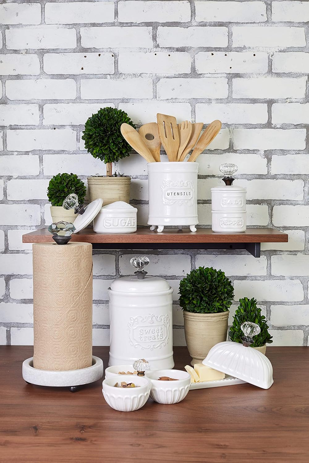 Fluted ceramic butter dish from Mud Pie features lid with vintage inspired glass door knob. Two piece set.