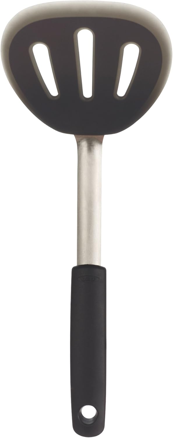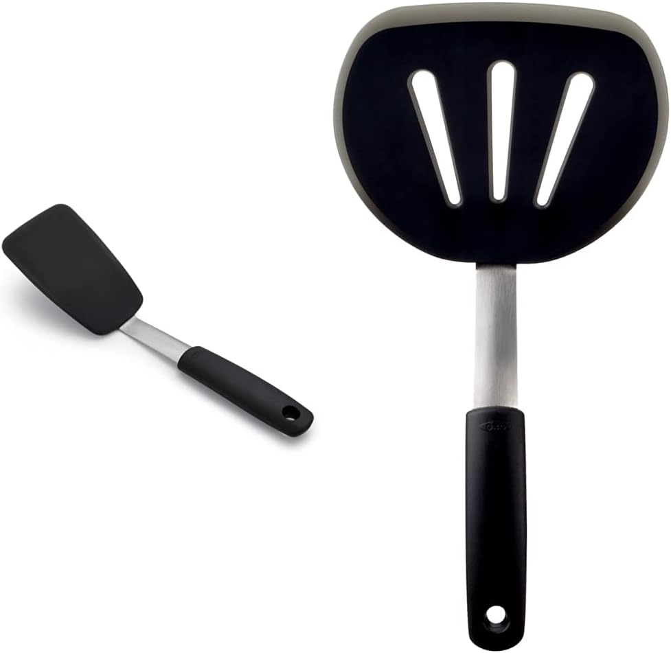 OXO Good Grips Silicone Flexible Pancake TurnerThe OXO Good Grips Silicone Flexible Turners combine the strength of stainless steel with the advantages of silicone. The silicone outer layer, which is high heat resistant and safe for non-stick cookware, is bonded to a flexible stainless steel core for added stability. The Turners have thin, flexible edges that glide easily beneath all foods and are perfect for flipping fragile foods while keeping them intact. The Silicone Flexible Pancake Turner is generous in size and easily flips pancakes, burgers and more. All Silicone Flexible Turners have soft, comfortable, non-slip grips and are the perfect companions to non-stick cookware and bakeware.OXO Good Grips Large Silicone Flexible Turner, Stainless SteelThe Silicone Spatulas surpass ordinary rubber spatulas, staying flexible longer without discoloring or melting. Silicone is easy to clean and safe for non-stick cookware. The soft, non-slip handles are cushioned for comfort as you cook, stir or scrape.